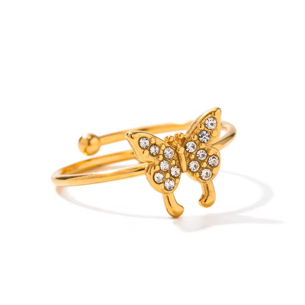 This Butterfly Ring is made of durable stainless steel and features a luxurious 18k gold plating that is both waterproof and hypoallergenic. Perfect for everyday wear, this ring combines style and functionality for a versatile accessory. A must-have for any fashion-forward individual.